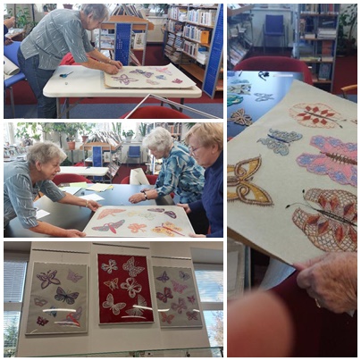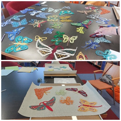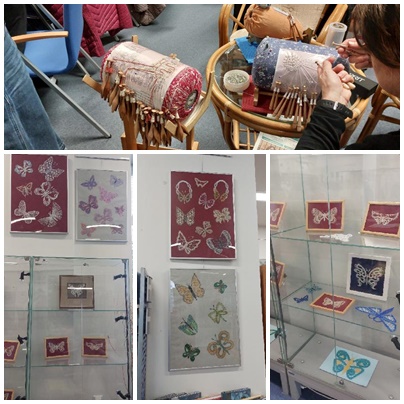 Motýli jsou upaličkovány různými styly (Art Deko, krušnohorský vzor, moderní styl…) a tak, jak který způsob vzoru a styl paličkování krajkářce z našeho spolku padl do oka.
